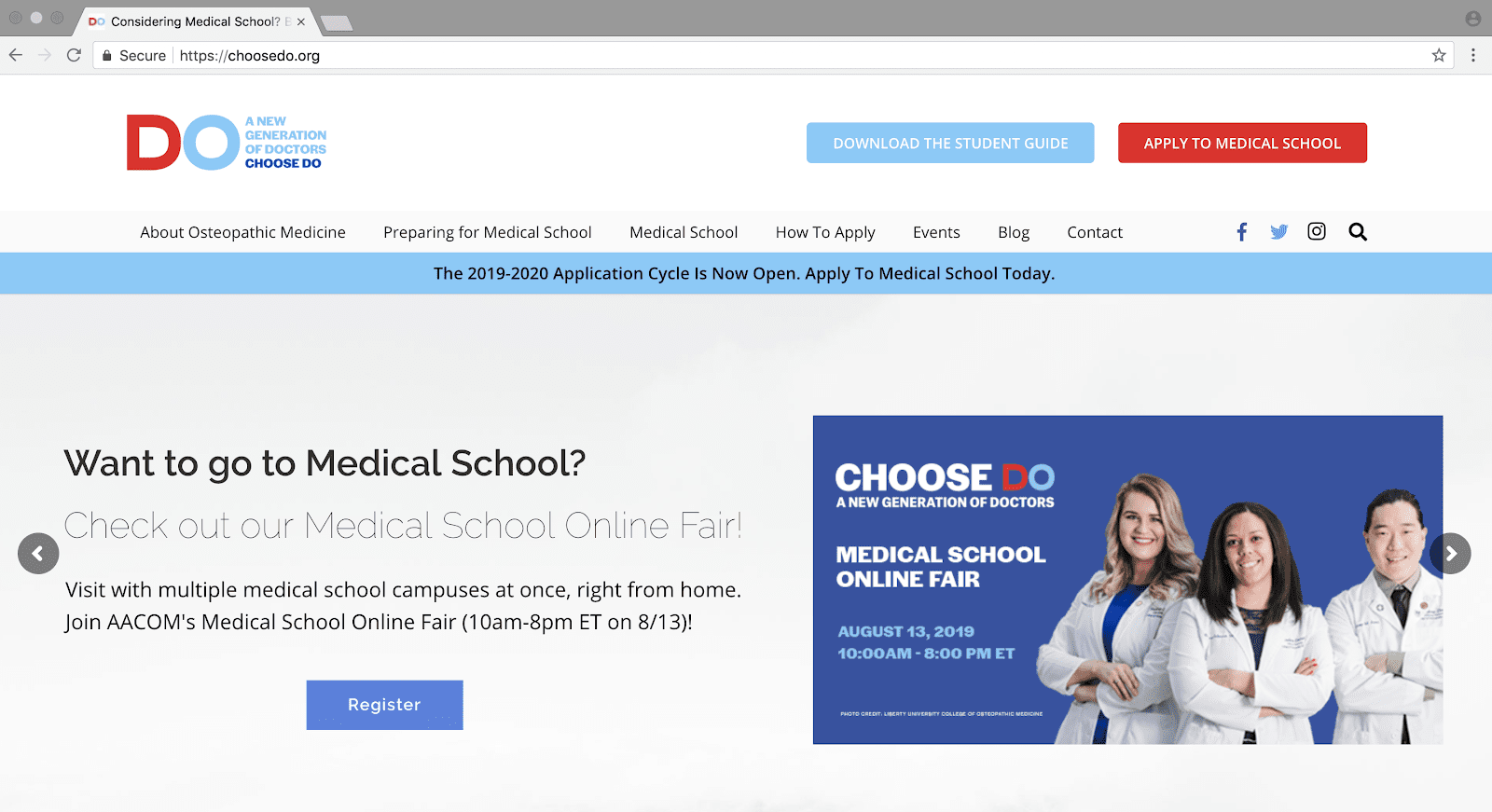 Would you like to learn about the profession, life as a medical student, and medical schools you may want to consider? Utilize the Upcoming Events tab of the website to find out about events like the Choose DO Medical School Online Fair.