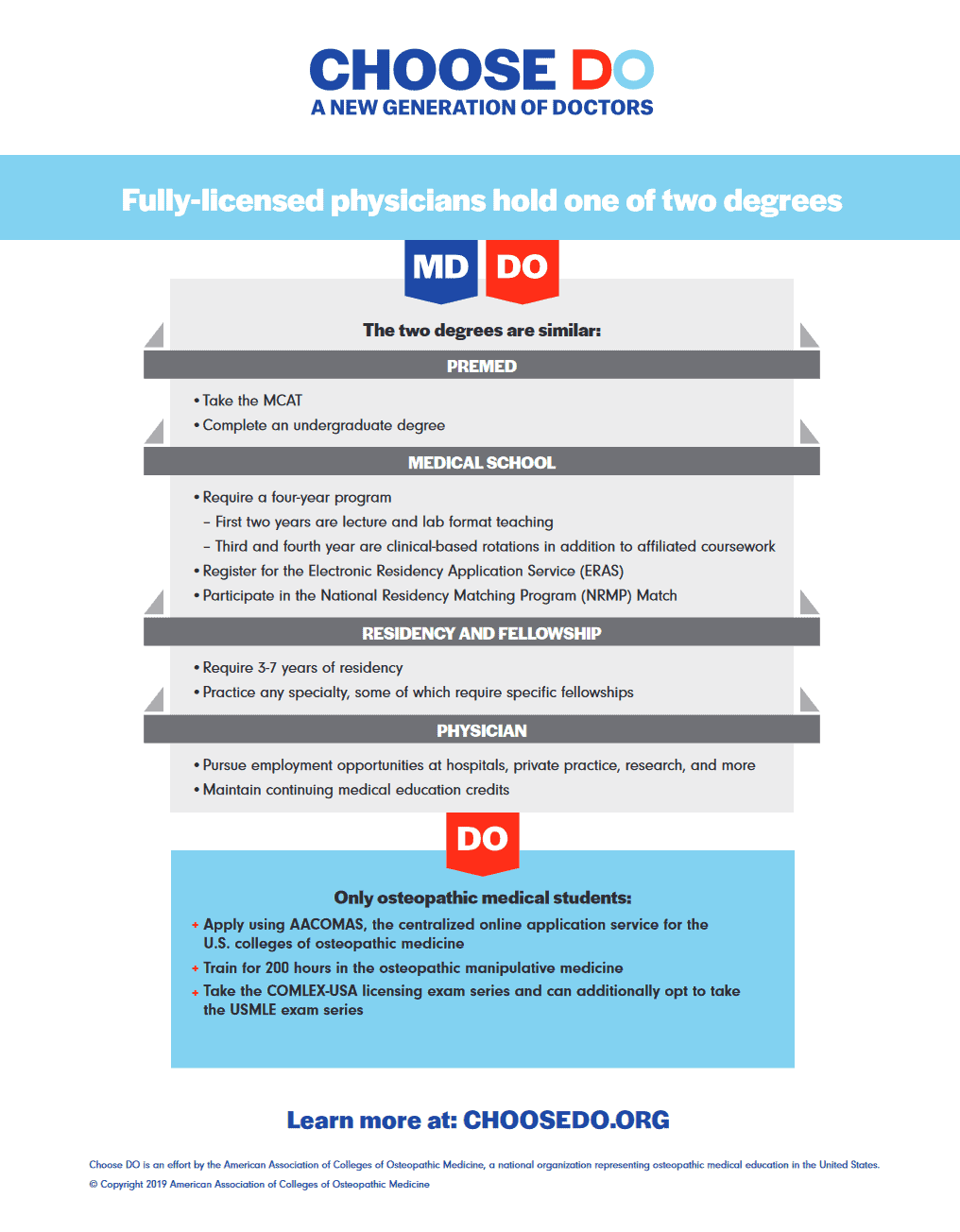 The student guide provides some of the most important information from the website, in addition to other resources premedical students will find helpful when applying to DO schools. The 2019 guide is 76 pages full of a letter from the AACOM President, an overview of the osteopathic medical field, information about medical education and accreditation, graduate medical education facts, and more. It is a more in-depth version of what you will find on the other pages of the Choose DO website all in one document, along with some fun pictures of current medical students, maps regarding admissions offices, figures with breakdowns of each year of medical school, and more. If you do not want to have to navigate through various pages of the Choose DO website, start with this student guide where everything is condensed into a large document you can save to your computer.