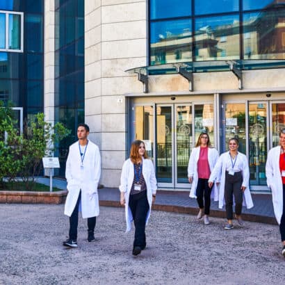 Atlantis students walking through the hallway of the hospital where they are shadowing (Genoa, Italy).